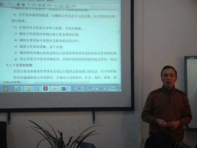 3.23日,公司聘請ISO9000管理體質(zhì)培訓(xùn)講師王兵老師對全體職員進(jìn)行培訓(xùn)學(xué)習(xí)。王老師以其豐富的現(xiàn)場管理經(jīng)驗,領(lǐng)導(dǎo)完成多項生產(chǎn)、質(zhì)量技術(shù)改造工程;策劃和推行以過程為導(dǎo)向的質(zhì)量有效控制與現(xiàn)場持續(xù)改善活動,解決公司產(chǎn)品的關(guān)鍵質(zhì)量問題,大大提高了產(chǎn)品的合格率。王老師在生產(chǎn)管理、質(zhì)量管理培訓(xùn)領(lǐng)域有豐富的授課經(jīng)驗,講授公開課暨企業(yè)內(nèi)訓(xùn)三百多次。講課主要特點是能針對不同的企業(yè)特點、學(xué)員層次、結(jié)合企業(yè)的實際情況采用不同的授課方式和內(nèi)容。