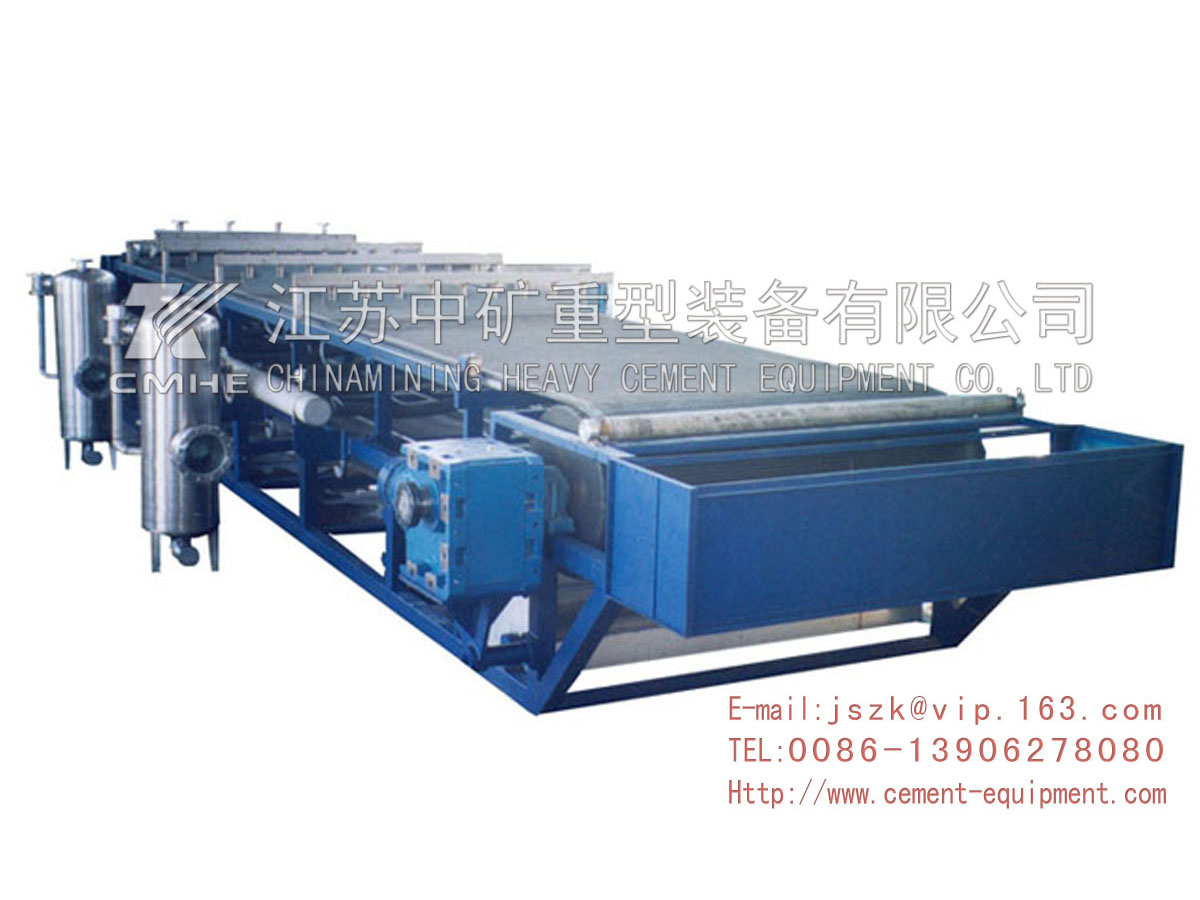 真空皮帶脫水機(jī)是一種用來(lái)分離固—液兩相組成的各種懸浮物的迅速過(guò)濾和脫水的高效分離設(shè)備。它主要由橡膠帶、驅(qū)動(dòng)輥、張緊輥、真空室、進(jìn)料裝置、濾餅洗滌裝置、卸濾餅裝置、濾布糾偏裝置、濾布張緊裝置、驅(qū)動(dòng)裝置,濾帶洗滌裝置、控制箱等組成。該機(jī)結(jié)構(gòu)先進(jìn),采用高強(qiáng)度的橡膠帶及濾布帶在機(jī)上既作環(huán)狀過(guò)濾帶,又作輸送帶。工作時(shí)物料由進(jìn)料裝置均布到移動(dòng)的濾帶上,在真空作用下形成濾餅,依次經(jīng)過(guò)過(guò)濾、洗滌、脫水、卸餅、濾布和濾帶洗滌完成循環(huán)。